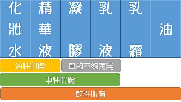 棠姐簡單建議各膚質使用的保濕保養品類別: